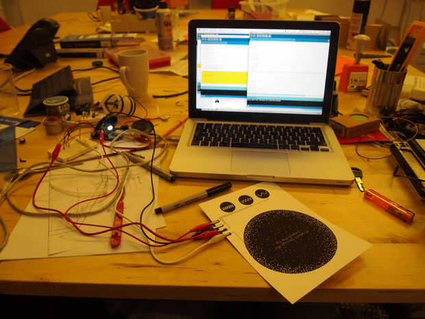 Esto es donde todo es un poco impredecible... Como todo el mundo va a ser la pintura o diferentes tamaños de puntos de contacto de Conductor desnudo con distintos grosores de tinta de impresión, es necesario un punto de calibración. Esperemos sea solo el sensor de la distancia que habrá calibrado. Eso debería ser bastante fácil de hacer por jugar el valor total2 en el código (se deben ver los valores desde el sensor en el monitor serial). Si eso no funciona para usted puede que necesite probar otros valores de resistencia. Me temo que este paso es un poco ensayo y error.
