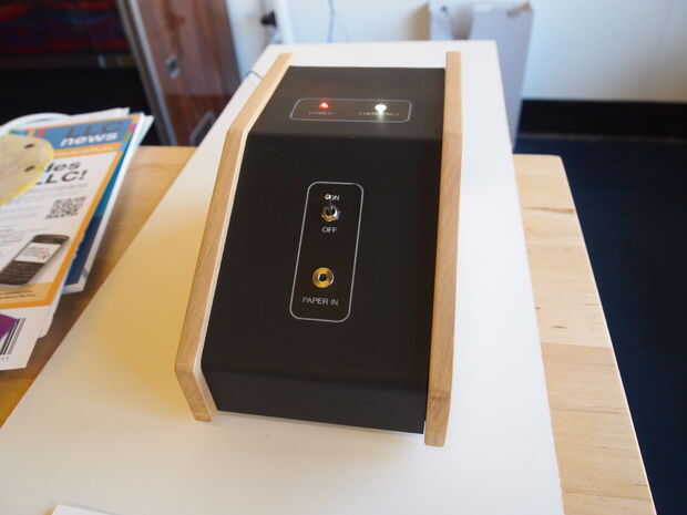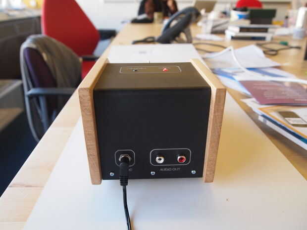 Este cuadro fue creado por láser corte acrílico blanco. El acrílico fue doblado entonces usando una pistola de calor, aerosol pintado negro y detalles grabados usando el cortador láser. Los lados de la caja fueron hechos de una buena madera de la cereza que tenía por ahí. El LED, enchufe hembra, interruptor, toma de corriente y salida tomas de audio eran todos entonces montado en el cuerpo de acrílico.