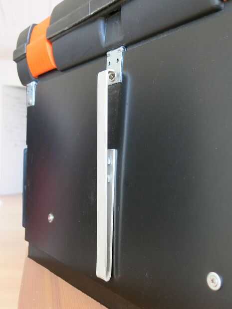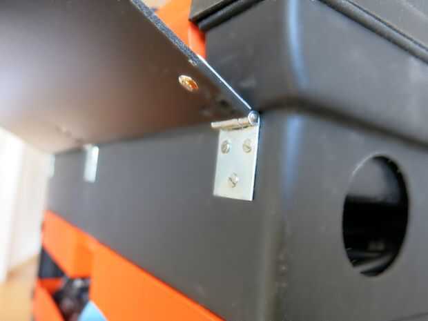 Cortar la placa de plástico a la medida, para cubrir la parte delantera (cajones). Instalar las bisagras, utilizando los tornillos pequeños + arandelas + tuercas (M3 está bien) o remaches.