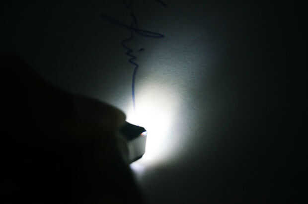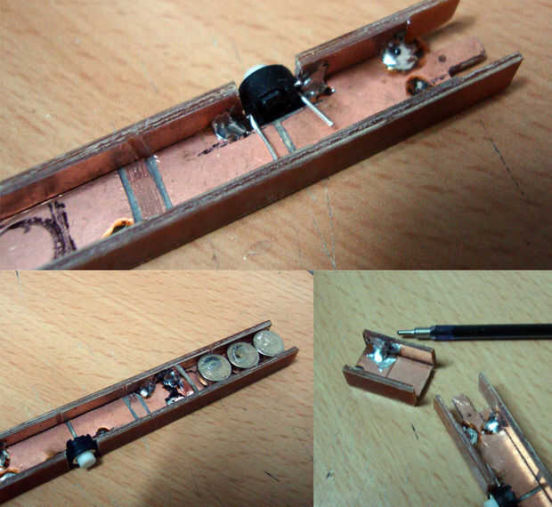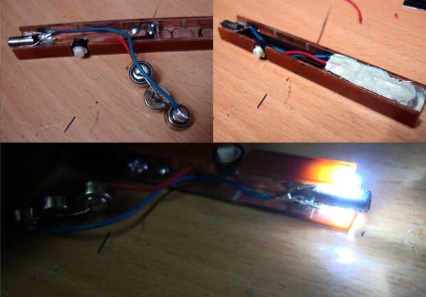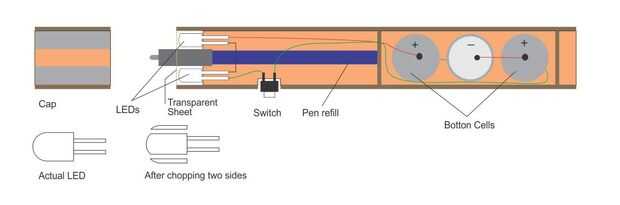 Este es mi antorcha de la pluma. Funciona con dos pequeños LED y tres pilas de botón, el caso de PCB está diseñado para cargar tres células, dos LED, interruptor y rellene. El LED es picado para encajar en la pluma.