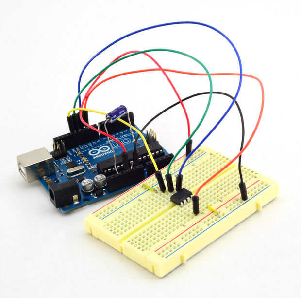 - Asegurar que su ATtiny85 es colocado correctamente con los carriles V + y GND polarizados, y los otros cables conectados a pines de Rúbrica femenina de Arduino:
