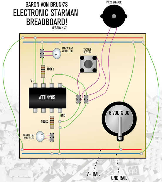 Común problema eléctrico: el ATtiny tiene un conector de tierra primaria (pin 4), pero pin 3 puede actuar como un conector de tierra, así, sin embargo, el pin 3 está reservado para el primer LED. Desde el primer LED en el pin 3 está conectado a tierra al terminal de tierra de la batería, esto completa el circuito entero, pero puesto que sólo parcialmente se basa el ATtiny, es como si tu circuito es en serie en vez de ser en paralelo, por lo tanto los LED estará apagados y el sonido es tranquilo, haciendo parecer como si sus baterías están muriendo. Además el pin de 3 LED está correctamente conectado a tierra, Asegúrese de que PIN de ATtiny85 4 está conectado a tierra, así , esto hace que el circuito completo, y la función de sonido y luces como. En otras palabras, pin 8 del ATtiny va al positivo, el pin 4 va al negativo y los otros pines conectan con sus respectivos componentes (que en última instancia conducen a tierra también). Cuando hice el primer circuito, me olvidé de soldadura pin 4 a masa, así mi circuito funcionaba--pero algo embotado y silencioso, que llevó mi inicialmente a creer que o bien las pilas eran trapos o que hice mal las conexiones.