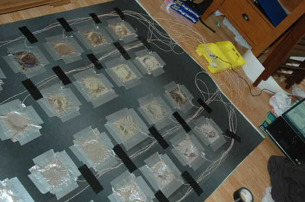 Recoger los cables por fila (paquetes de seis) y con cinta adhesiva hacia abajo en el espacio para que no se muevan durante su uso e interferir con los interruptores. Dejo el espacio abierto para que la mat puede ser doblada en el medio de transporte más fácil.