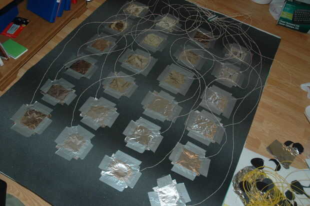 La electrónica se encuentra en el extremo de la alfombra Twister, así que escoja cual quiere en el. Los cables más largos se unirá a los interruptores de lámina de aluminio que están más alejados de la electrónica. Los cables para obtener más cortos a medida que se acerca a la electrónica.