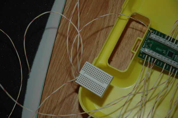 Como habrás dado cuenta, hay 4 cables a tierra y sólo dos puertos de la tierra. Hay dos formas sencillas alrededor de esto. Se requiere equipos de soldadura, el otro requiere una placa de prototipado pequeño. Usted podría conseguir usando cinta adhesiva en lugar de la soldadura, pero no lo recomendaría.