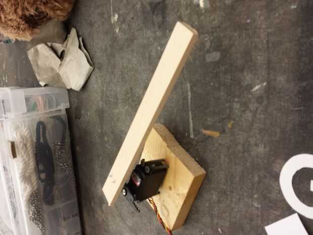 Utilice una pistola de pegamento para pegar ese pedazo motor madera en el lado de la cabeza de una manera que hace brazo largo madera del Servo recorren toda la cabeza, a través de todo el camino hasta la punta de su nariz. Asegúrese de que el pegamento pistola de todos los lados de la tabla de madera para obtener mejores resultados.