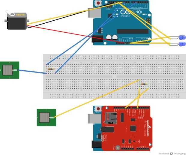 Utilice este diagrama para completar el circuito. Las 2 tablas de detección capacitivas son realmente piezas de tela conductora conectada a la barriga del oso de peluche desde el interior al lado para detectar táctil (o empuje) desde el exterior.
