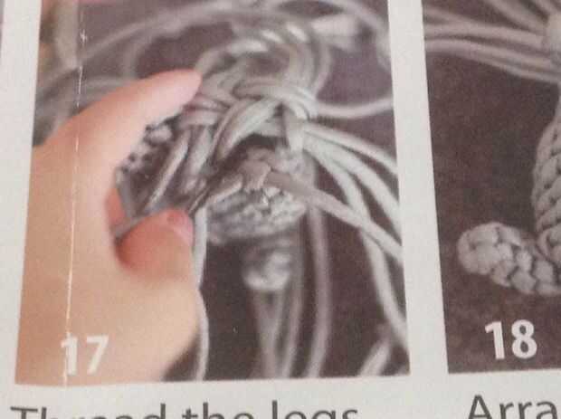 Hilo de los cables de la pata delantera en tu cruz no del cuerpo. Cuadro above.make las piernas en el lado de sam. Cuerda separada en 4 grupos otra vez. Y hacer otro nudo cruzada.