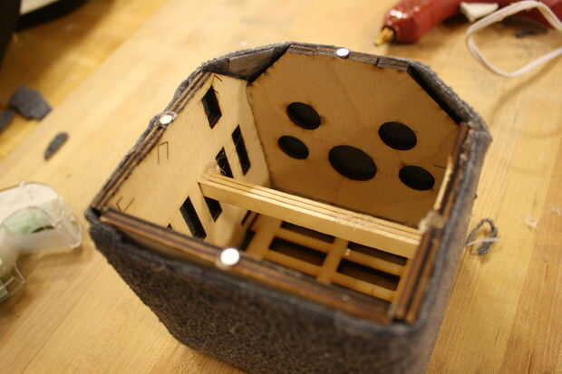• Encajan todas las piezas de lado juntos, si no tienes el espesor indicado de madera o cartón, puede reforzar las conexiones con una pistola de pegamento caliente.