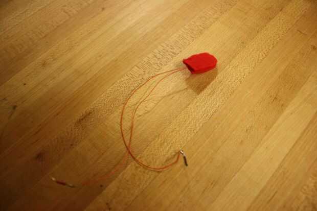 • Arrancarle dos trozos de cinta, coloque la parte conductora del cable en cada cinta, coloque las cuatro capas de velostat entre las dos piezas y la pieza de la cinta juntos. (Hay más información aquí sobre cómo hacer un sensor de presión de cinta adhesiva)