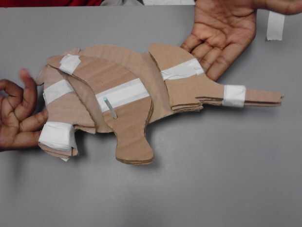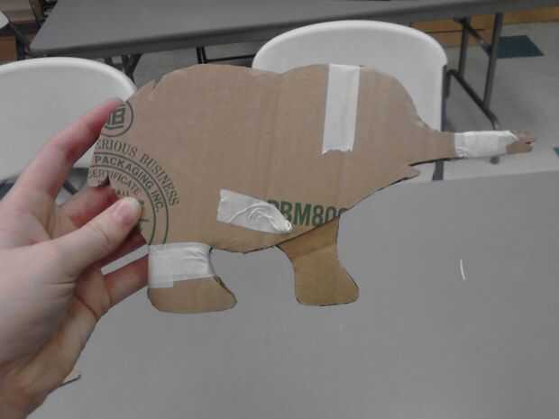 Alinee las piezas apiladas, como se muestra en la foto. La pila de pata se alinee con la pata trasera, la pila de tronco se alinea con la cabeza y el tronco y la pila de gatillo se alinea con el extremo más largo hacia la parte trasera del elefante.