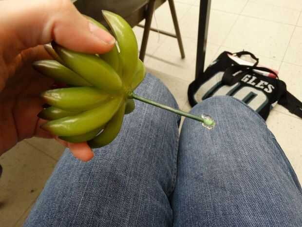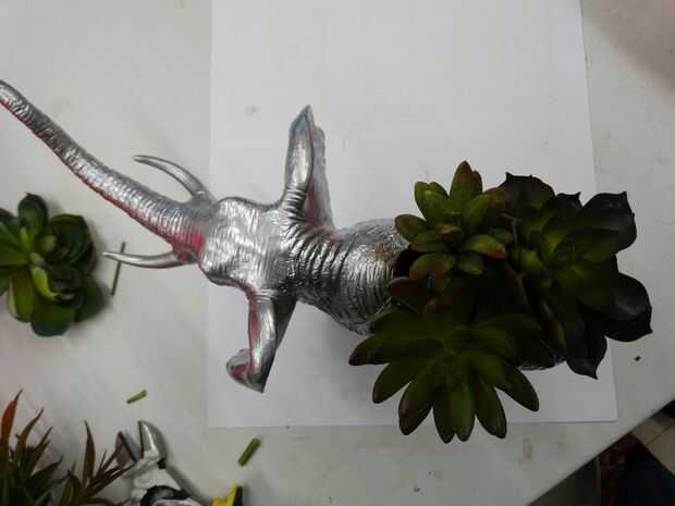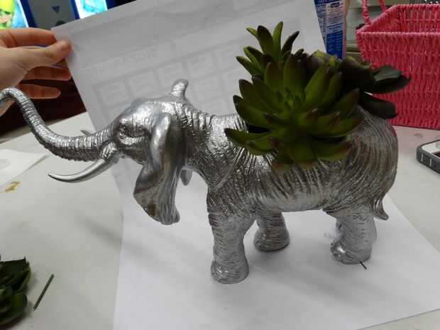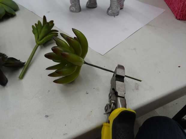 -Utilice unas tenazas para cortar suculentas hasta la altura deseada para el arreglo. Coloque un poco de pegamento caliente en el extremo del primer suculento y en la espuma. Repita para las 2 suculentas finales. Me gusta planificar la colocación de las diferentes plantas suculentas en primer lugar, cortar y pegar en la espuma.