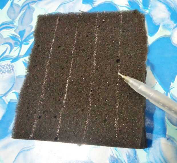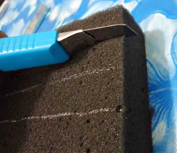 Cortar según las líneas. Pero no va todo el camino en la esponja apenas a medio camino. Luego pegar la esponja en el cuadro de