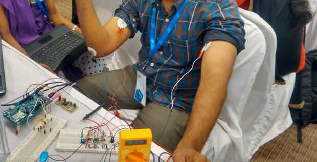 Se coloca el electrodo EMG sobre las armas de mano para detectar el movimiento de los músculos. Tercer electrodo es un electrodo de referencia debe colocarse perfectamente ya que la variación en la colocación puede causar cambios en el voltaje de salida.