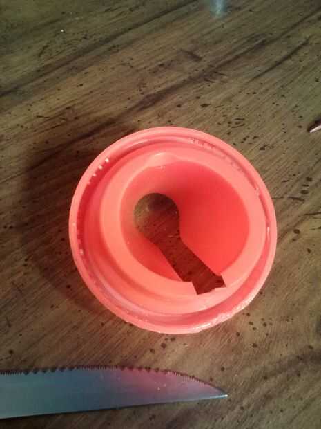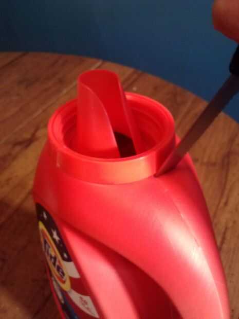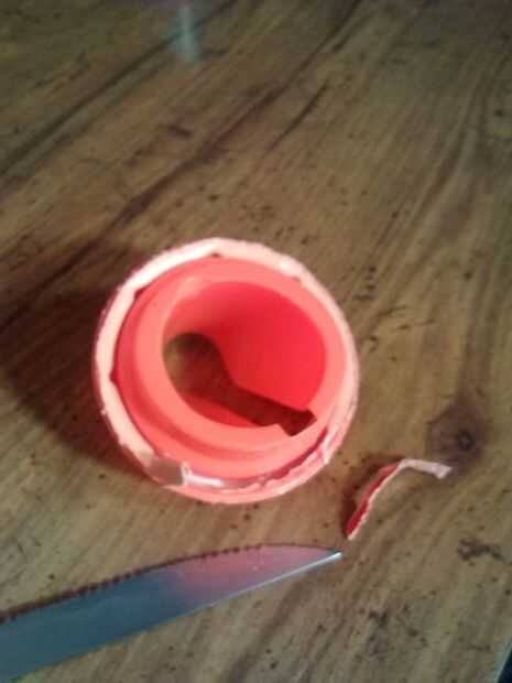 Corte con cuidado alrededor del borde del pico con el cuchillo. Una vez retirado, saque el borde de plástico en el interior de la boquilla.