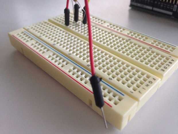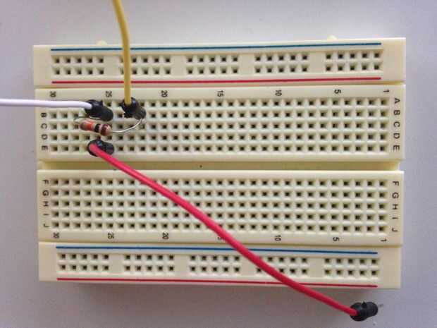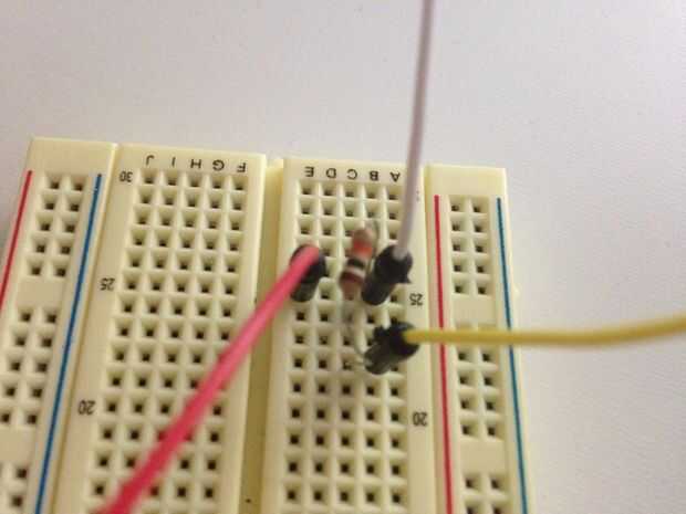 4. ALS je este 2 kabels erin heb gedaan kan je het protoboard erbij pakken en dit precies zo aansluiten als op de foto es gedaan. De plek maakt niet uit als de resistencia maar goed es en het cojín van het stroom maar goed loopt. Hiermee spelen es dan ook een goede oefening.