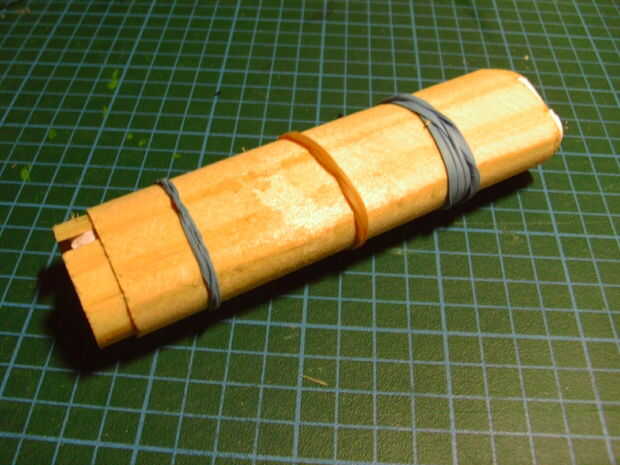 Coloque la abertura de cada capa en los lados opuestos del alumbrador y pegar con una fina capa de pegamento de madera regular. Mantenga todo apretadamente con bandas de goma.