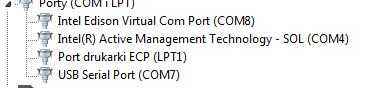 5. ir al administrador de dispositivos en Windows y buscar en "Puertos (COM y LPT)" que número de com está asignado a la board Intel Edison (verás por ejemplo USB Serial Port (COM7)).