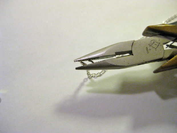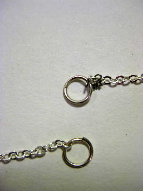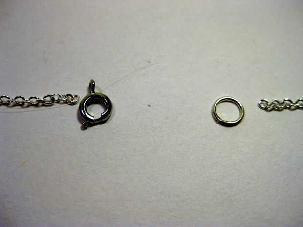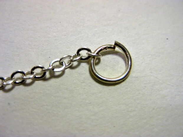 Con la terminación de su grano establecido su tiempo para acabar.  Utilice alicates de punta para abrir los anillos de conector.  Deslice la cadena sobre el anillo y cerrar el anillo (ver figura) puede utilizar alambre de artesanos si es necesario.