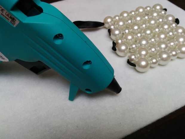 Ahora la montaña ha sido trazada. Es el momento para pegar las perlas para el fieltro. Que bajo de tierra blanca es el fieltro. Agarrar la pistola encoladora y comience por pegar el primer grano para el fieltro. Pegue cada grano de otros para no ver demasiado seco pegamento en el resultado final.