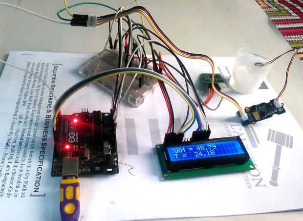 Este proyecto sentido de la temperatura y humedad de su habitación o ambiente y compruebe ya sea está en gama cómoda o no. Si encuentra que la humedad relativa es menor que el fijado, se enciende el humidificador durante 10 segundos, luego otra vez comprueba el nivel de humedad. Si no es adecuada entonces otra vez se enciende. Sensor de temperatura y humedad HSM - 20G estudio Seeed se utiliza aquí para sentir la temperatura y la humedad. Una pantalla LCD se utiliza para mostrar el nivel de temperatura y humedad en su habitación. Puede utilizar botón de Grove para controlar manualmente el humidificador. Para el control de todas las cosas que se usa Arduino UNO.