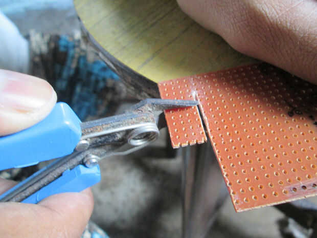 • Ahora cortar esa parte usando la hoja de sierra para metales y finalmente cortar piezas más pequeñas usando el cortador de alambre. El cortador de alambre funciona mejor para alisar los bordes. Ahora corte cuatro pistas de cobre en el medio como lo he hecho.