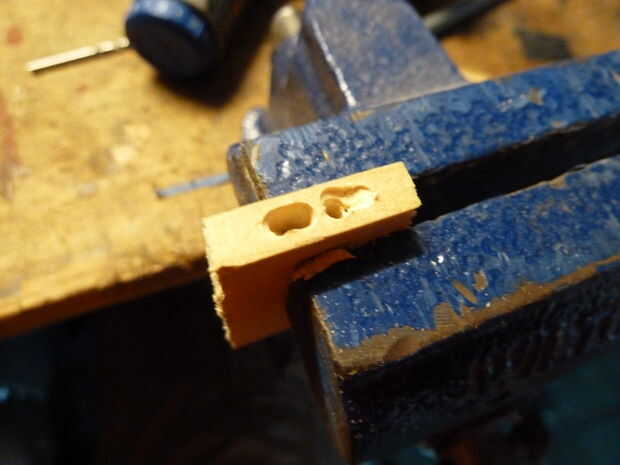 Corte una tira de la madera que es un poco más grande que la unidad de Flash.  No te preocupes de lo que es perfecto aún, que viene más adelante.  Poner la tira en un vicio y perforar algunos agujeros en la parte superior, teniendo cuidado de no empujar los agujeros en el lado.  Es un poco complicado, rompí la madera en mis primeros intentos de algunos.  El mejor Consejo que puedo darte es ir despacio y con cuidado.