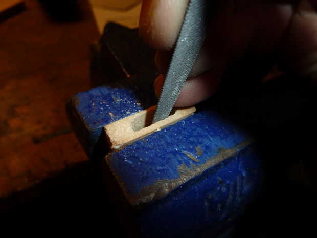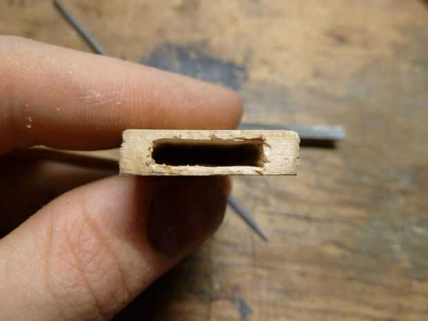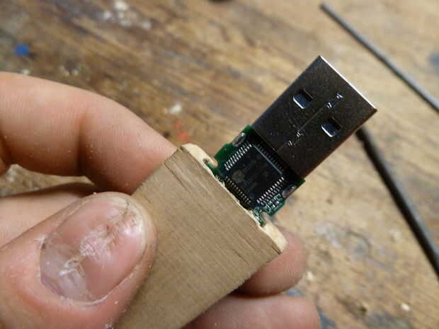 Una vez que ha perforado los agujeros primeros, presentar la madera entre ellos con su archivo de pin. Ensancha y forma la cavidad hasta que la unidad de Flash se ajusta perfectamente. Usé la Dremel para profundizar y ampliar la cavidad en la parte más gruesa, siendo extremadamente cuidadoso para no romper las paredes, como siempre. Utilizar los archivos para aplanar las paredes de la cavidad y crear rincones agradables, sharp.