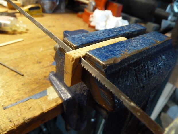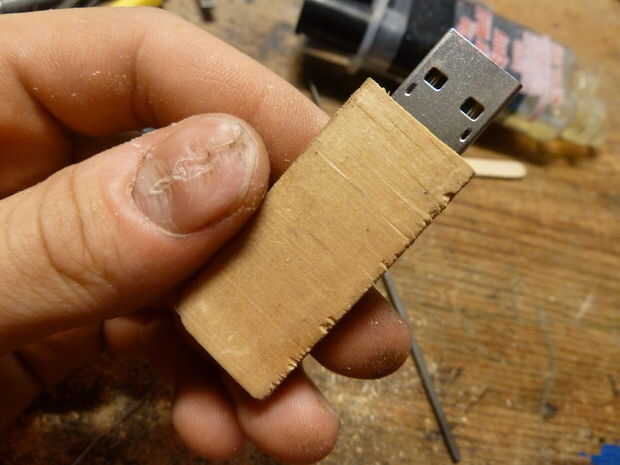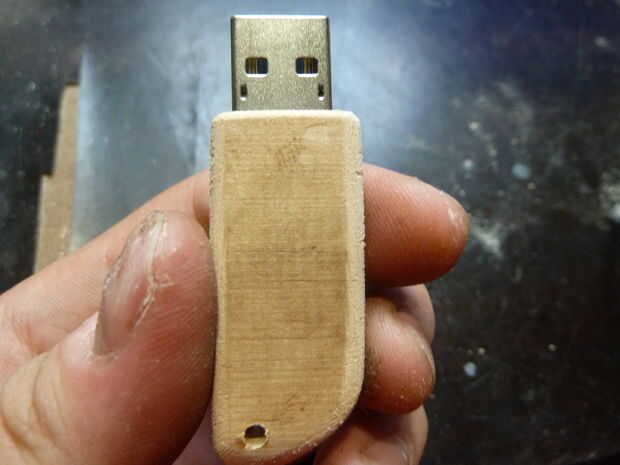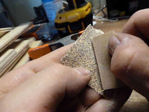 Ahora es el momento para sacar el exceso de madera. Con algún papel de lija muy áspero, o un cuchillo x-acto o una sierra (si realmente tienes un montón de exceso), molido (o corte), en los bordes hasta que tenga el ancho deseado, luego redondear todas las esquinas y los bordes con papel de lija. Si usted utiliza enrasar, debe tener algo extra de madera en la parte inferior que no ahuecar. Cortar un ángulo en esto y me perforó un agujero para un llavero. Después de que han alcanzado su forma y ancho deseado, tomar algún papel de lija de grano fino y circulan por todos los bordes para hacer todo agradable y suave.