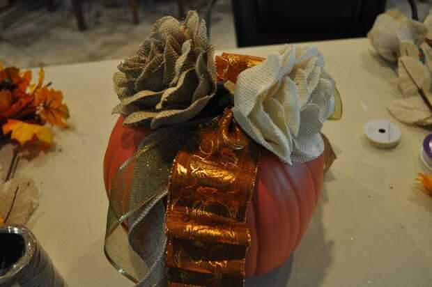 Empecé con las rosas de arpillera grande. Corte los tallos y pegamento caliente en el centro de la calabaza. Que hacia unos de otros. Si hay arpillera hojas en el tallo, guardarlas para agregar a la calabaza así.