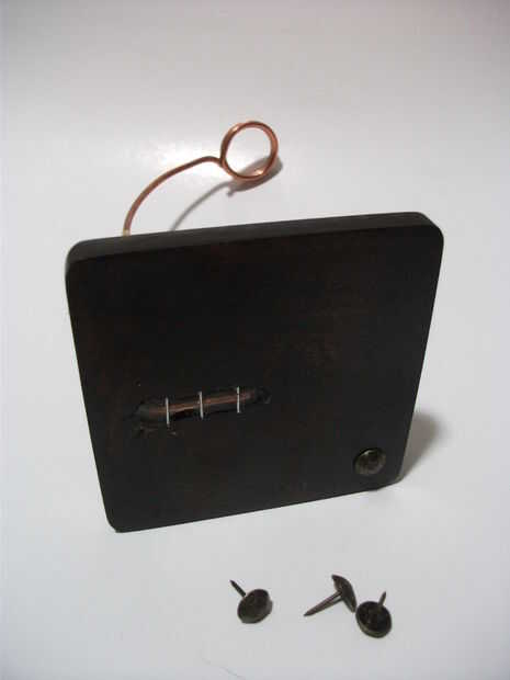 Pongo el cobre a través del orificio perforado, había doblado en forma de "L" y había asegurado hacia abajo con un pequeño biy de pegamento caliente con grapas. Una vez que estaba seguro usé algunas tachuelas de tapicería para los pies. Tengo la pegatina que va sobre las grapas y cobre final.
