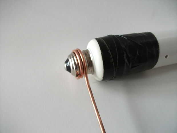 Tal vez usted tiene un pasador de madera, tal vez del pvc... He utilizado el extremo de enchufe macho de una bombilla CFL de trabajo muy pesado que se había roto. Esto unido a algunos pvc y me mi gopper alrededor forman mi "toma" del viento. Estoy seguro que hay maneras más fácil pero esto funciona para mí. De todos modos, sólo algunas veces envuelto alrededor, nada importante.