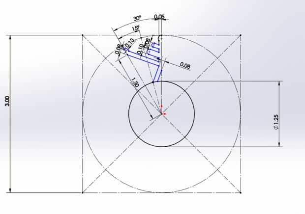 Puesto que esto es para el concurso de diseño de ornamento, mi copo de nieve tenía que ser menos de 3 pulgadas en cada dimensión. Hecho un delimitador cuadrado para contener mi diseño de 3 pulgadas, luego comenzó a añadir elementos para el "brazo" de mi copo de nieve. Sólo la mitad del brazo debe ser dibujado hacia fuera ya que el diseño se refleja en el siguiente paso. Es útil saber cuántos brazos tendrá (en mi caso, seis) para calcular los ángulos. Tengo pensado poner algo en el centro de mi copo de nieve, razón por la cual el brazo no va hacia el centro.