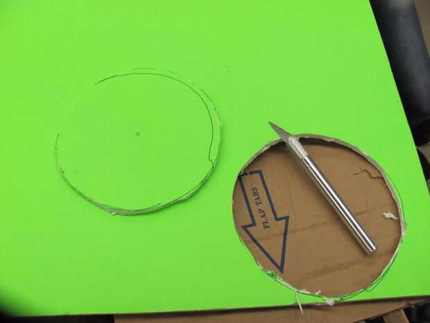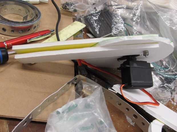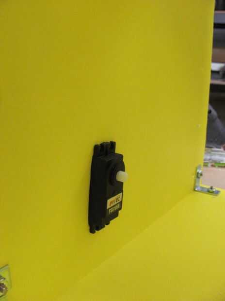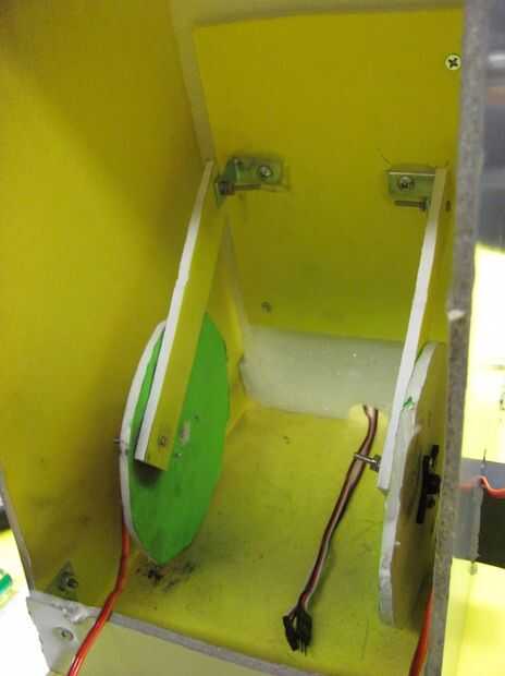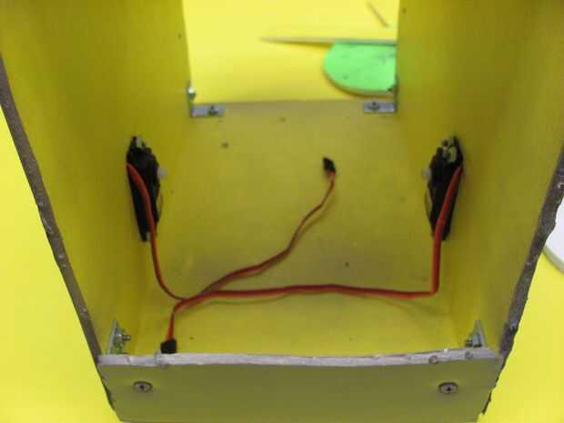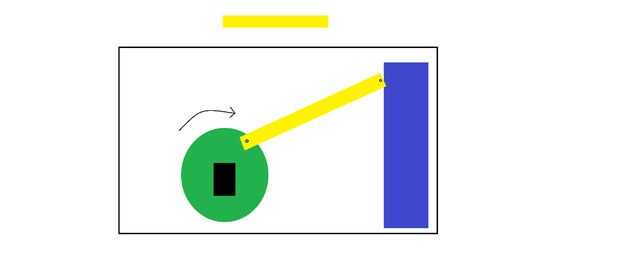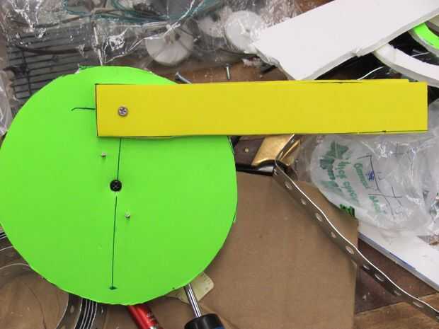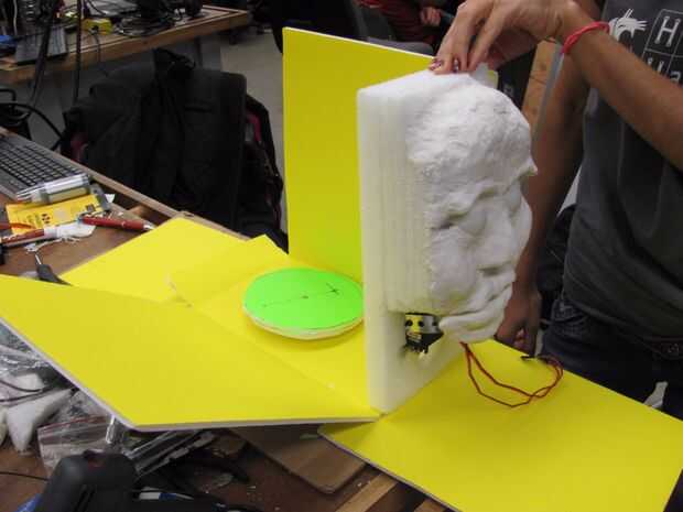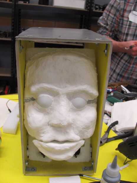 A continuación, la mecánica para hacer la cara para salir de la caja se puede abordar de muchas maneras diferentes. La cara va a salir la caja con bisagras en la base, una forma de mostrar su ser activado. El método utilizado consistía en montar dos servos en el cuadro para hacer girar una rueda. Un brazo se colocar las bisagras en ambos lados, en la rueda conectada al servo y la parte posterior de la espuma de la cara. El diagrama de arriba representa un modelo simple de cómo se mueve la cara.