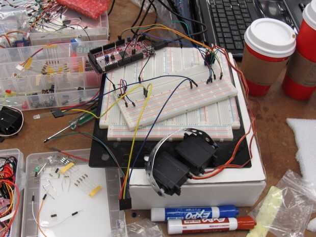 Conectar los servos y las luces es explicativas mirando el código de arduino representado a continuación. El altavoz se rasga aparte para poner en la caja.