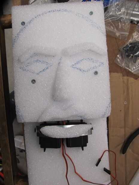 Comenzar a añadir la espuma a la cara añadiendo un esqueleto. Los servos están representados por debajo de la mandíbula. Recomiendo pegar y atornillar la mandíbula inferior de la espuma para el metal perforado. Esto da una idea de proporciones, al llegar a un buen contorno de la cara, comienza caliente pegar la cara.