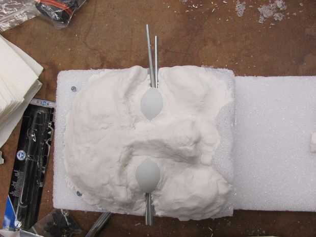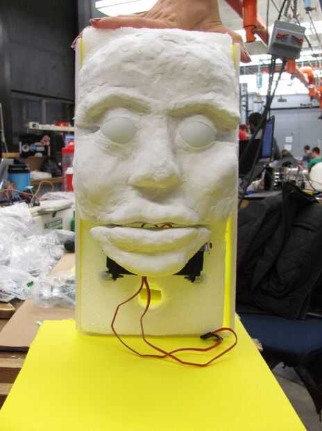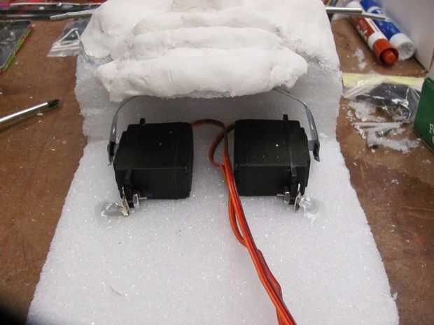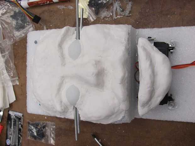 Montaje de los servos, usando pegamento caliente y las abrazaderas de ángulo recto más pequeños en la espuma. Comenzar la adición de arcilla para la cara! Asegúrese de empacar la arcilla hasta la espuma bien para estabilidad. Asegúrese de hacer hincapié en la frente, mejillas, nariz y mentón, labios.