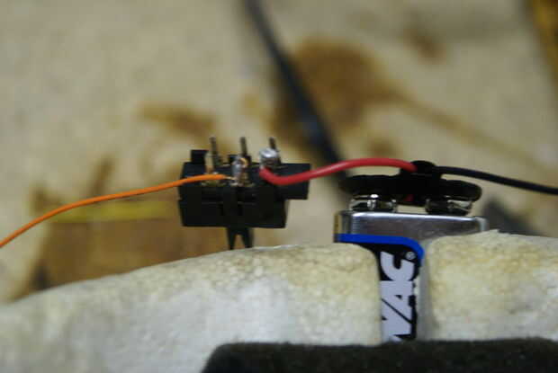 Luego de la soldadura el + del clip de la batería a una de las conexiones del interruptor. Luego soldar un cable a una conexión diferente. En otras palabras, soldadura por lo que funciona como un interruptor.