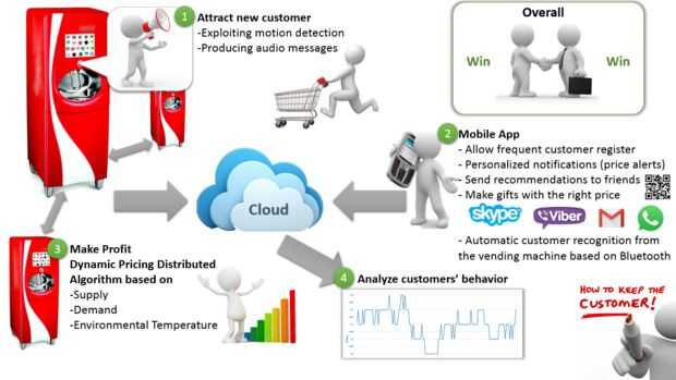 Después de algunos días, el cliente decide explorar las características de la aplicación inteligente de la máquina expendedora. La primera impresión fue que la aplicación proporciona sólo los precios de las máquinas expendedoras más cercano. Sin embargo, el cliente se da cuenta de que él o ella puede configurar alarmas de los precios de la soda, recomendación de enviar de una máquina expendedora o un regalo a sus amigos alrededor del mundo a través de Viber, Skype, WhatsApp, Facebook, etc..
