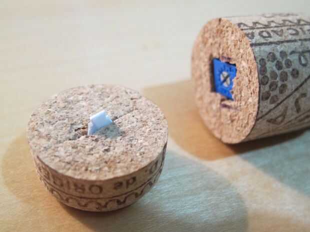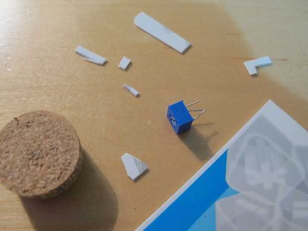 Usando una tarjeta de plástico, hice un eje entre el potenciómetro y el corcho. Todo fue pegado con pegamento instantáneo.
