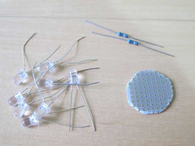Preparar una pieza redonda de la placa de prototipos, dos resistencias de 10 ohmios y 8 LEDs.