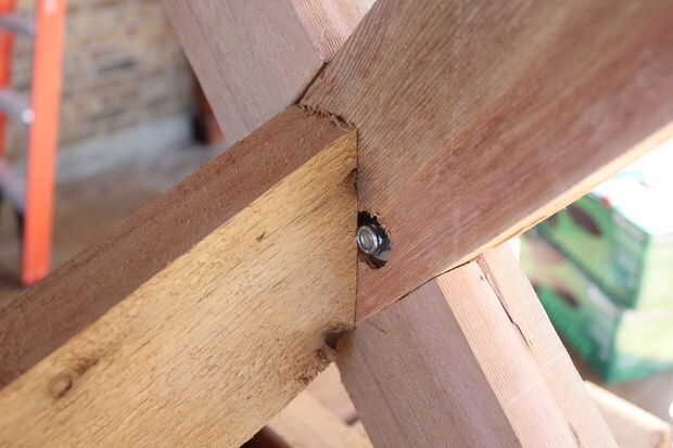 Para la estabilización adicional, usé estos apoyos para evitar el bamboleo de lado dramático.  Funcionó bastante bien.  El solo bamboleo que me sale es de la sección que va desde el suelo hasta la rodillera como resultado el 2x4s pequeño como las piernas, que por eso te recomiendo el 2x6s en su lugar.  Para mi llaves, medido hacia fuera a ser un corte 19° y 71°.  Dos tornillos en la parte exterior de la sección transversal de las patas y luego dos en el soporte central deben hacer el truco.