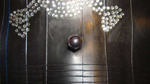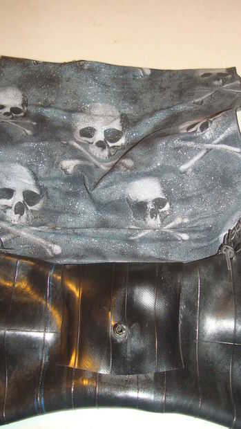 Este elegante bolso se hace de una llanta de bicicleta, y el cuerpo está hecho de un tubo interno más grande. Está adornado con hierro en pedrería, joyas rojas y cráneo y huesos de la guarnición. He utilizado la boquilla del tubo interior para el cierre y funciona muy bien.