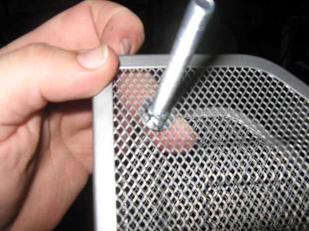 9.) usar los cortadores de Di y cortar los patrones en la malla de la titular de la revista out. Comprobar que el tornillo se puede pasar por estos agujeros limpiamente.