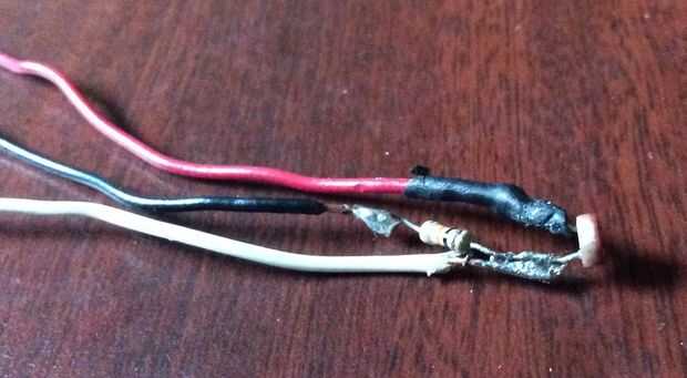 1. Soldar un cable blanco entre la conexión de la fotocélula y la resistencia de 10 k. Este será el cable de salida.