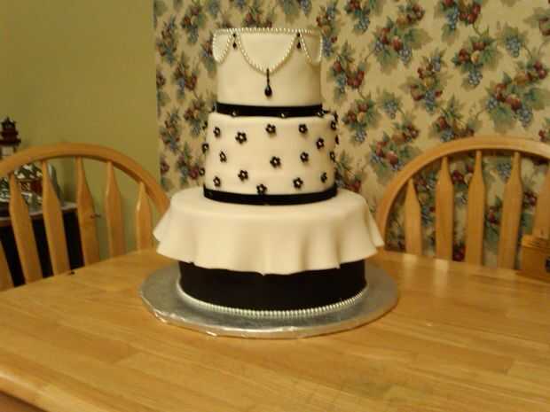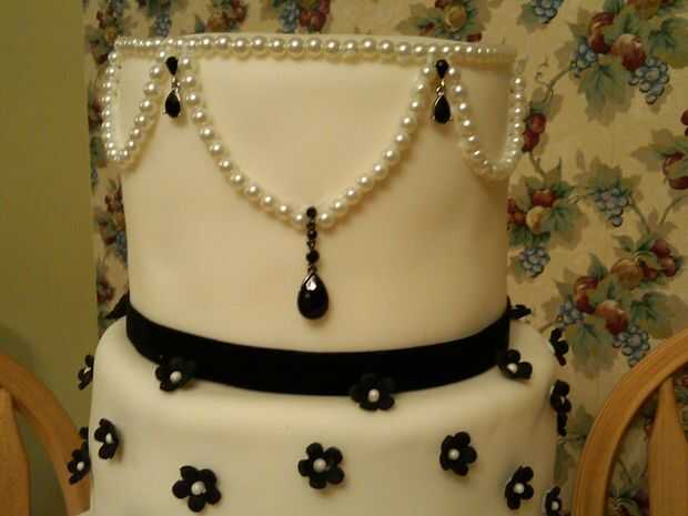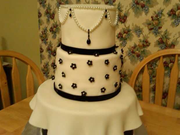 Cubrir el nivel superior con fondant blanco y la parte inferior con una cinta negra como lo hizo con el segundo nivel de línea. Línea de la parte superior con el mismo tamaño de perlas (plástico o pasta de azúcar) que se utilizó para el nivel inferior de la línea. A continuación, utilice el mismo tamaño de las perlas para crear un efecto de drapeado en el nivel superior. Si está usando una hebra de perlas de plástico, el drapeado será muy sencillo - simplemente conecte con glaseado real. Si usas perlas de fondant, asegúrese de contorno donde quieres ir antes de fijarlos - esto le asegurará no tienen cortinas desproporcionados! Terminar el nivel superior con algunos detalles en negro - utilizamos negro joyas que puedes encontrar en la joyería que hace la sección de tiendas de artesanía. También se podrían hacer más flores de fondant negro, o algunos negro fondant perlas - lo que más te guste.