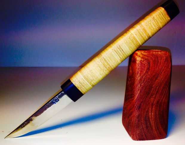 Material necesario: piezas delgadas de bambú, pequeños pedazos de plástico negro o rojo (preferiblemente Micarta u otro plástico adecuado para encolado y lijado), pegamento para madera, lijadora de tambor, banda Sierra. Y una buena navaja con un eje largo y fino.