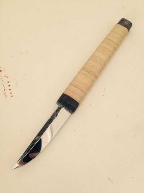 Historia para este cuchillo:Mi hijastra es muy creativo y competente en la cocina. Cosas que ella puede convertirse en una comida fabulosa. Para su graduación de high School secundaria actual hice un cuchillo de cuero rollo así que ella podría tomar