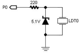 Para este instructable utilizamos un Digilent chipKit Max32, un 6.1V Diodo zener, un sensor de vibración, un módulo sin hilos de bluetooth, un micro servo y resistencias de Ohm 2 100. El sensor de vibraciones puede tener una tensión máxima de 70V que es mucho mayor que la cantidad permitida para el chipKit que estamos usando. Para restringir este voltaje a poco más de 5V max, conectamos el circuito de arriba con un 6.1V resistencia Diodo zener y 200 Ohm en lugar del 5.1 y 220 en la imagen. Después de construir este circuito, tenemos conectado a la Max32 con el perno hacia fuera conectado al pin analógico 1.