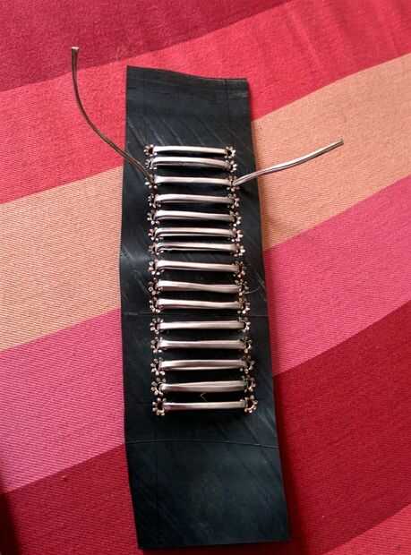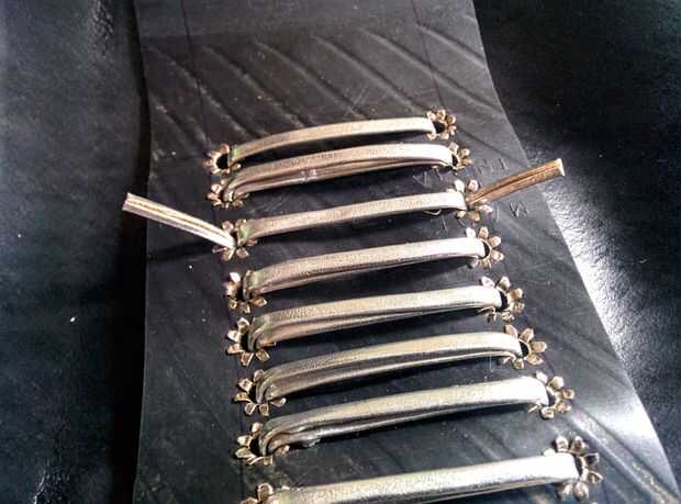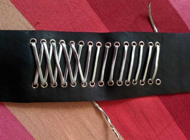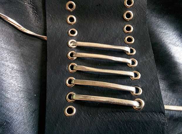 - Cuando todos los ojales están cubiertos para hacer el patrón cruzado, a la pulsera para atrás y cortar las cadenas largas más pequeño tales que sean lo suficientemente pequeños para ser escondida detrás de la pulsera.